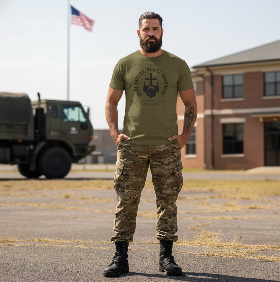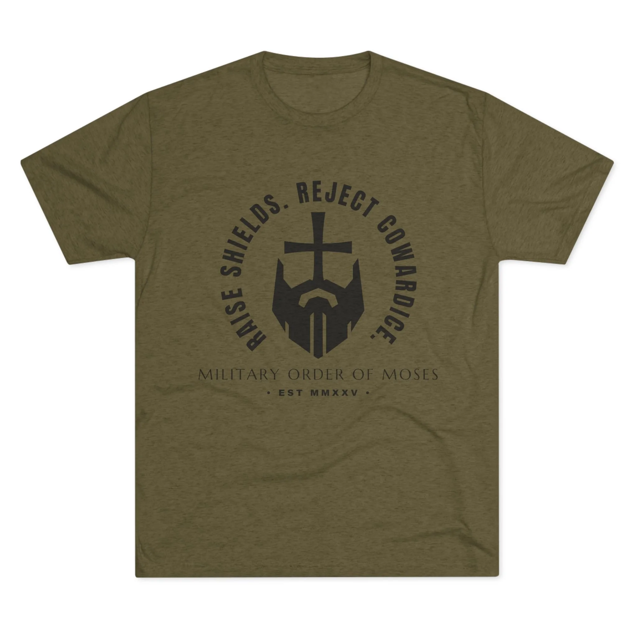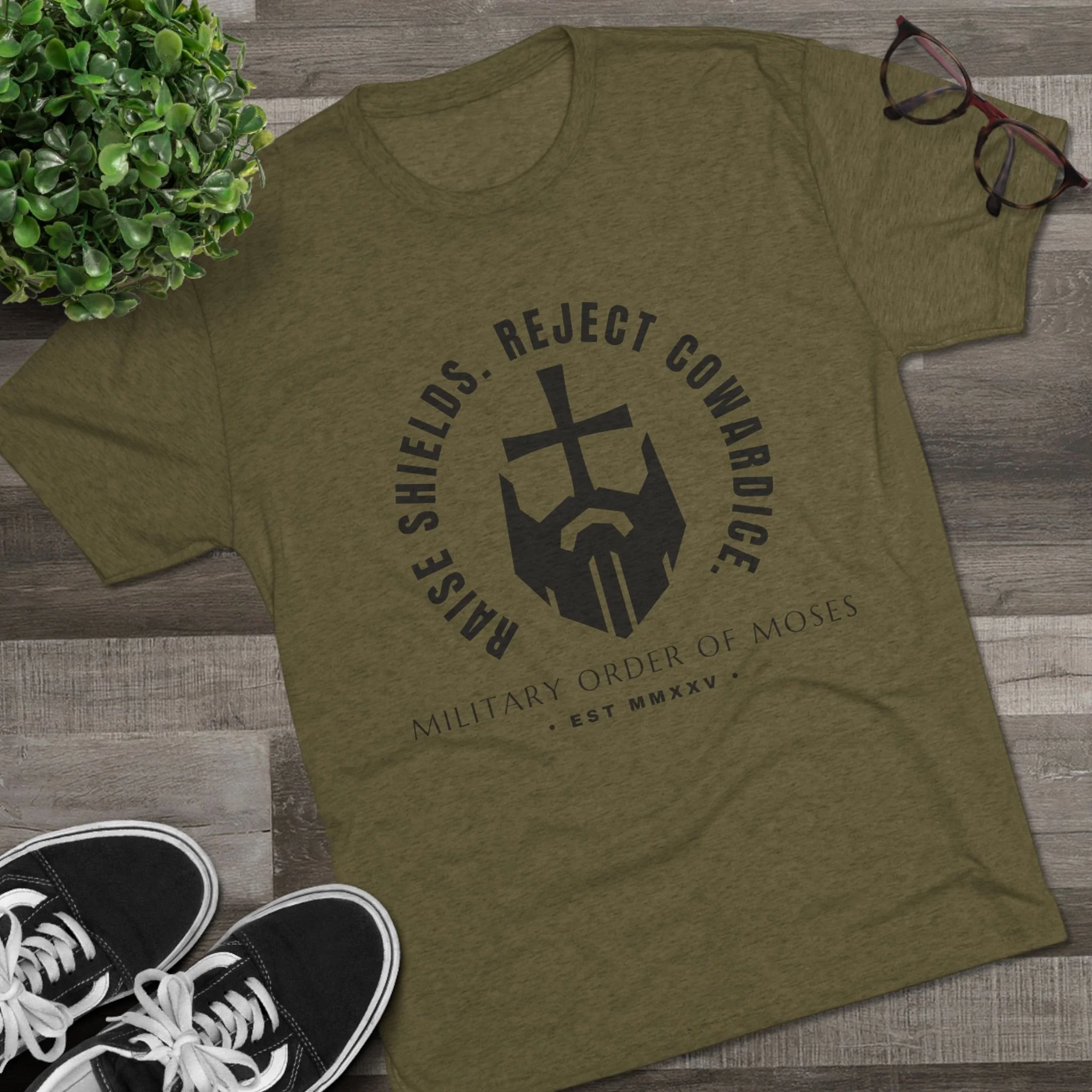 Embrace quiet strength and steady conviction with the "Raise Shields. Reject Cowardice." Tri-Blend Tee from the Military Order of Moses. This lightweight and soft crew neck t-shirt features a our striking logo, that serves as a modern emblem for those who value honor, discipline, and unwavering faith. It's more than just a shirt; it's a personal banner for a pared-down wardrobe.